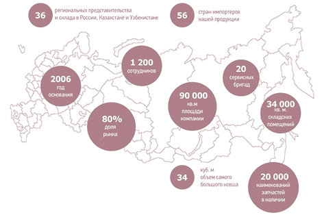Деятельность организации давно вышла за пределы Ивановской области. Мы поставляем нашу продукцию по всей России, в страны СНГ и за рубеж. Компания растет и расширяется. Площадь собственного логистического центра (г. Иваново) - 30 000 кв.м. Открыты собственные региональные представительства и склады в 37 субъектах РФ и СНГ. В данный момент ведется строительство на территории особой экономической зоны (ОЭЗ) завода по производству дорожно-строительной техники, запасных частей и комплектующих.